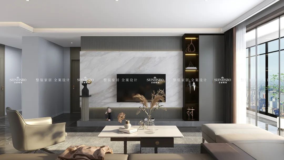 墙面的岩板中带着丝丝缕缕的轻柔纹理,宛如细水清流,不会过于单调,也不会过分杂乱。木饰面、金属、石材、棉麻等多变的材质衬托空间。地毯选择材质比较厚重的灰麻色调,在宽敞的客厅中界定了相对柔和的区域,传递着随性、沉稳而不失品质感的生活方式。